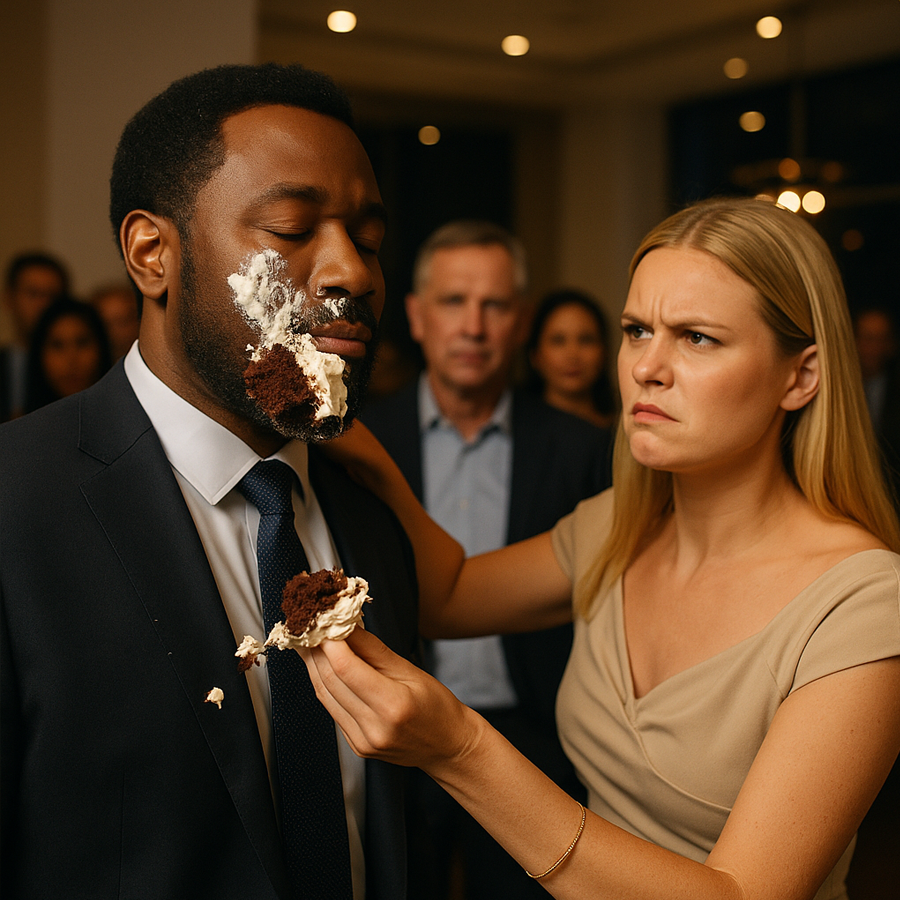 El salón se congeló. Nadie se atrevía a moverse. El pastel cubría el rostro del empresario, que permanecía inmóvil, con una calma inquietante.