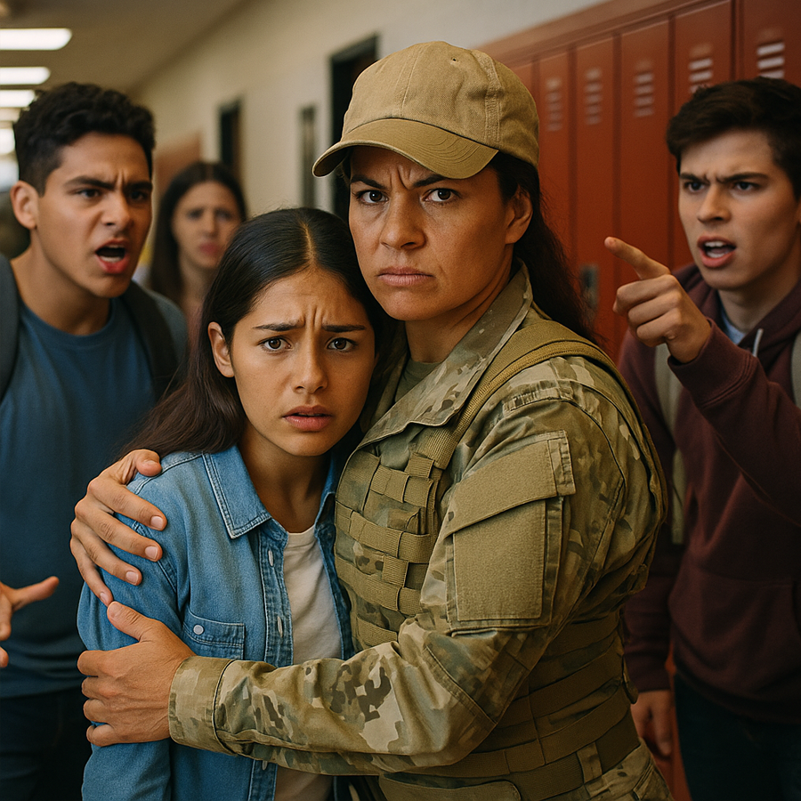 “Los abusadores eligieron a la persona equivocada para meterse con ella — pensaban que era una simple chica de campo, pero cuando su hermana gemela apareció vestida de uniforme militar, el pasillo entero se congeló. Nadie imaginaba que la misteriosa recién llegada era una leyenda de la Delta Force, y lo que hizo después no solo detuvo a los agresores, sino que dio a toda la escuela una lección inolvidable sobre respeto, fuerza y valentía.”