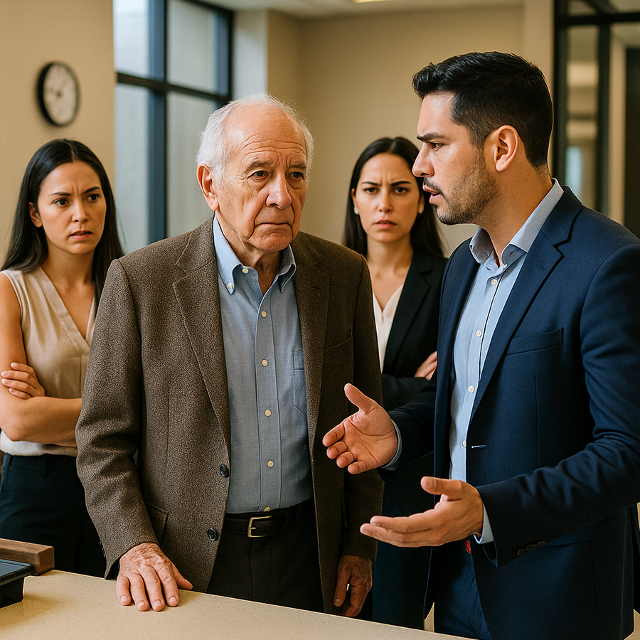 Sin embargo, el anciano no parecía molesto. Sonrió con amabilidad y se sentó pacientemente en una de las sillas del lobby. Desde allí observaba todo: la velocidad, la arrogancia, las prisas. Parecía un espectador de su propia historia.