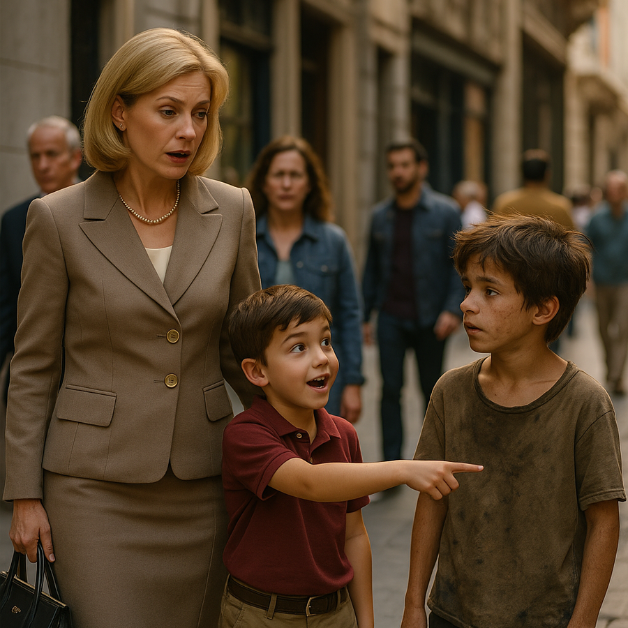 La madre, una empresaria reconocida en el sector inmobiliario, quedó petrificada al mirar al joven sucio y desaliñado que su hijo señalaba con inocencia. Su rostro cambió de color, sus manos temblaron y, por un instante, el silencio fue absoluto. Aquella frase inocente había abierto una grieta en la fachada perfecta de una familia poderosa.