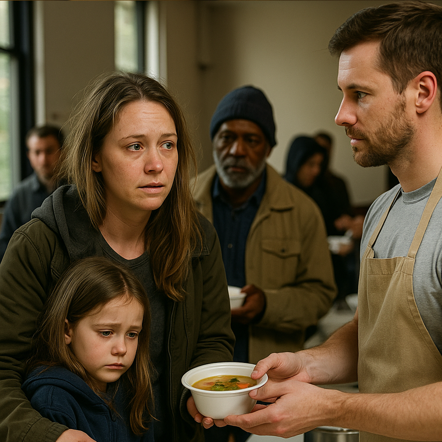 Cuando finalmente llegaron al frente de la fila, un hombre joven les ofreció un plato de sopa con una sonrisa amable.