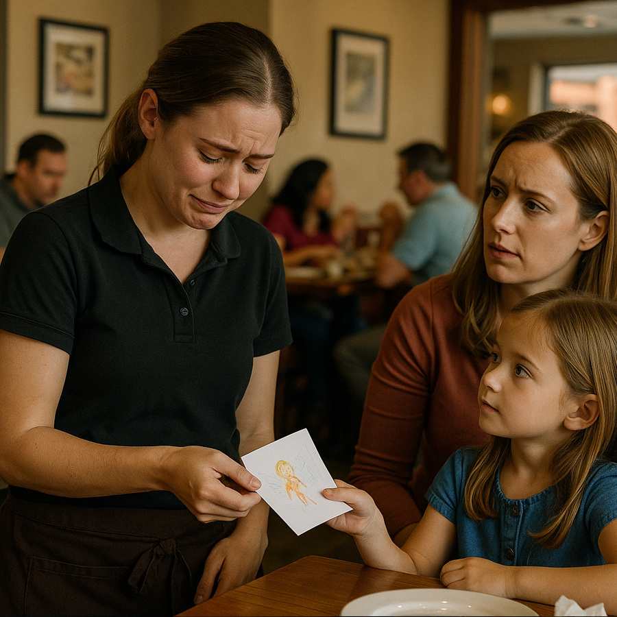 Minutos después, Sofía hizo algo inesperado. Con un lápiz de colores que llevaba en su mochila, tomó una servilleta y dibujó una figura sencilla: una mesera con alas, como si fuera un ángel. Abajo escribió en letras torcidas: “Gracias por tu esfuerzo. Eres importante.”