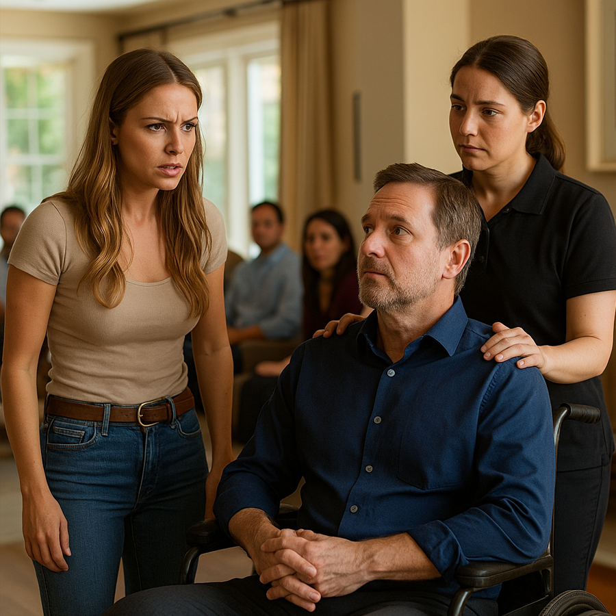 Cansado de la farsa y de la traición de Mónica, Hernán decidió poner fin al engaño. Reunió a todos en la sala: su novia, su empleada y algunos amigos cercanos. Con un gesto inesperado, se levantó de la silla de ruedas y caminó con paso firme.