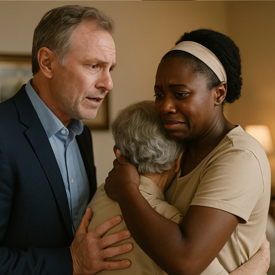 Una tarde, Alejandro volvió antes de lo previsto. Al entrar en la sala, escuchó sollozos y se acercó intrigado. Lo que vio lo dejó sin palabras: su madre anciana, frágil y con lágrimas en los ojos, era sostenida en un abrazo firme por Clara, la empleada que él apenas notaba.