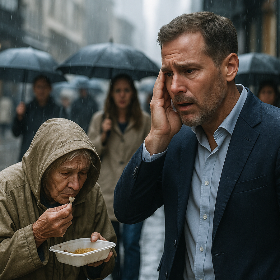 Millonario ve a una anciana comer bajo la lluvia… y descubre una verdad que lo destruye