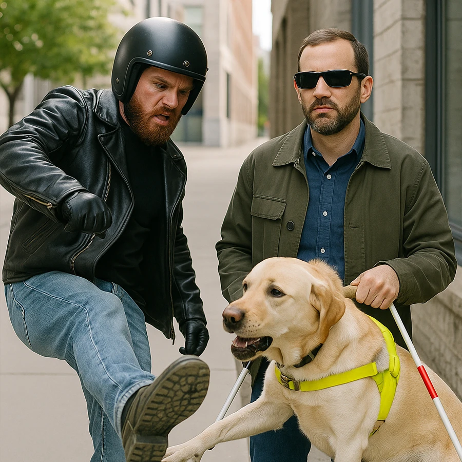 Molesto porque el perro bloqueaba parcialmente el paso, el motociclista bajó de su vehículo, lanzó insultos y, en un arrebato de furia, le dio una patada al animal. El perro se tambaleó y gimió, mientras el hombre ciego quedaba paralizado entre la sorpresa y el miedo.