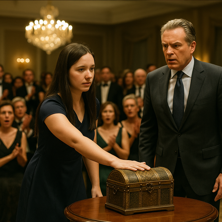 Sin vacilar, extendió la mano y rozó el cofre con firmeza. El salón estalló en exclamaciones. Los empresarios se levantaron de sus asientos, algunos aplaudían, otros no podían creerlo.