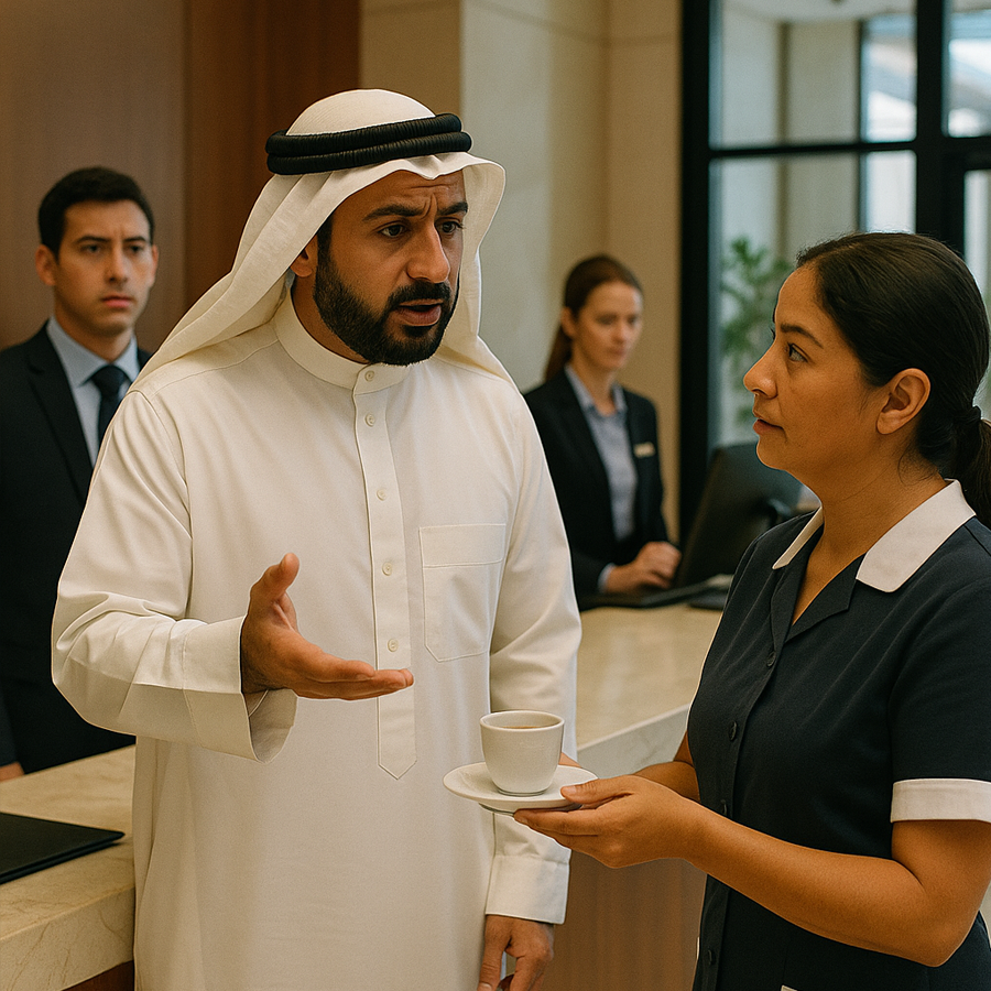 Su nombre era Hassan Al-Malik, un empresario árabe conocido por su fortuna y por su discreción. Había llegado sin previo aviso, con una reserva gestionada directamente por su oficina en Dubái. Pero algo no iba bien. El recepcionista, Ricardo Torres, se esforzaba por comunicarse, mientras el huésped hablaba con un tono cada vez más impaciente en un idioma que nadie entendía.
