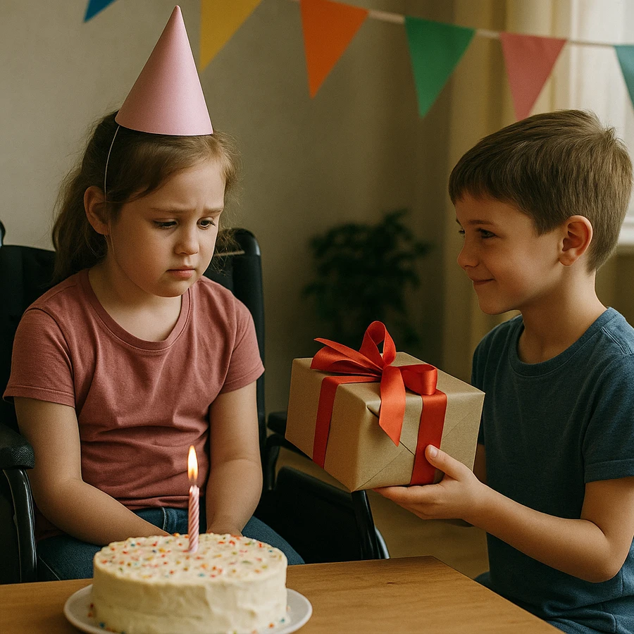 Era un día soleado, lleno de ilusiones para la pequeña Lucía, una niña de nueve años que había nacido con una discapacidad que la obligaba a usar silla de ruedas. Su madre, con esfuerzo y mucho amor, había preparado una fiesta sencilla en casa: globos de colores, una mesa con pastel, y pequeños adornos hechos a mano. Todo estaba listo.