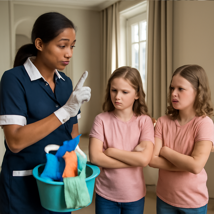 Las gemelas, sorprendidas por la respuesta tan inesperada, se quedaron en silencio por un momento. Era la primera vez que alguien no se dejaba llevar por sus actitudes rebeldes. Rosa, sin levantar la voz ni perder la calma, comenzó a limpiar la sala, moviéndose con una eficiencia impresionante. No les prestó más atención que la necesaria, pero se aseguró de que su presencia no fuera ignorada. Fue entonces cuando algo comenzó a cambiar en las gemelas.