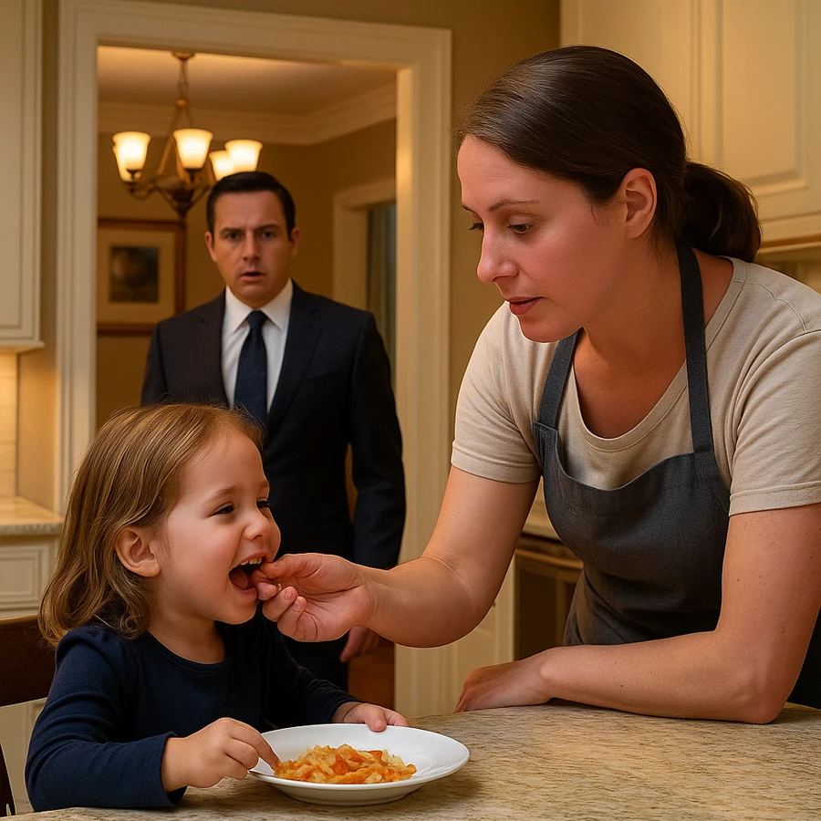 La niñera, nerviosa pero firme, respondió: “Señor, la niña no quería comer. Lo intenté todo, y solo aceptó de esta manera. Prefiero verla alimentada que dejarla con hambre”.