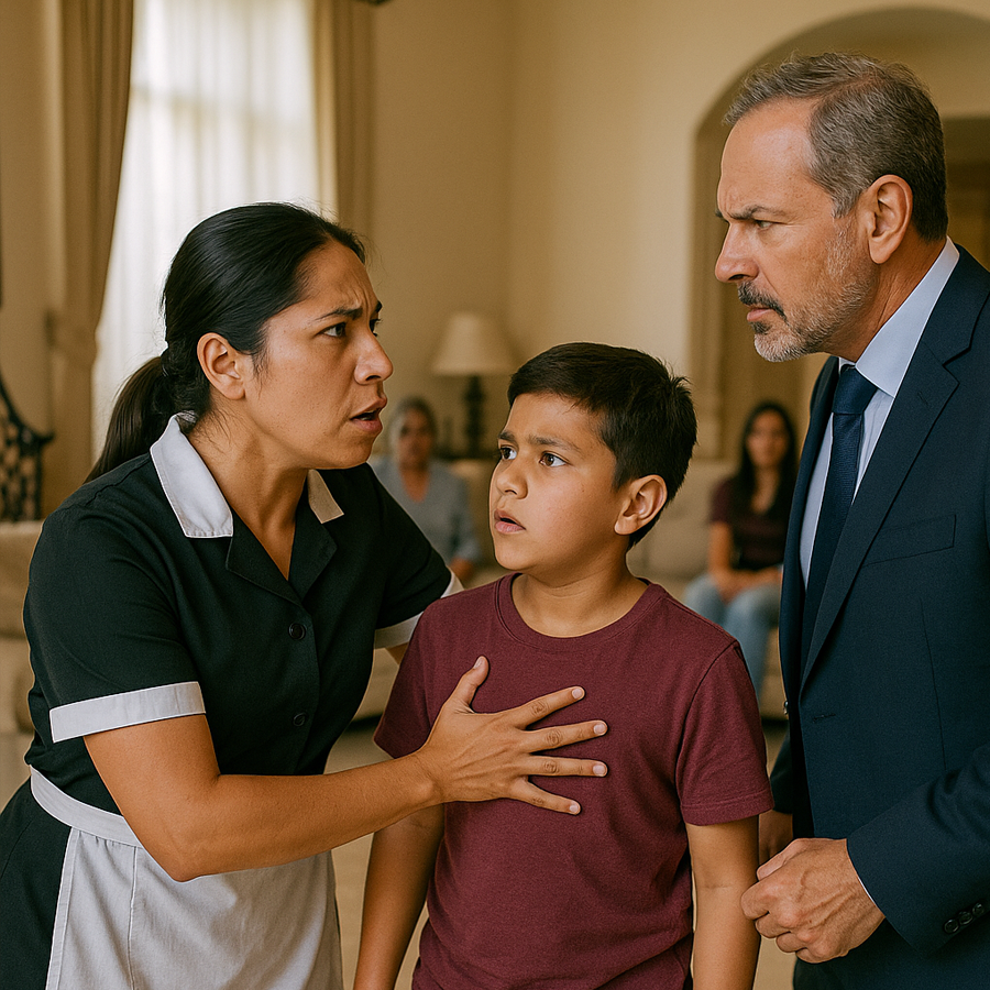 “O multimillonario más temido de la ciudad descubrió algo que lo dejó sin palabras: su empleada doméstica, una madre humilde, defendía con ferocidad a su hijo frente a un grupo de invitados poderosos. Lo que ella hizo para proteger al niño cambió todo, pero la reacción del empresario fue aún más impactante. Nadie esperaba que aquella confrontación entre dos mundos tan distintos terminara revelando un secreto que lo haría replantearse todo lo que creía sobre el poder y la lealtad.”