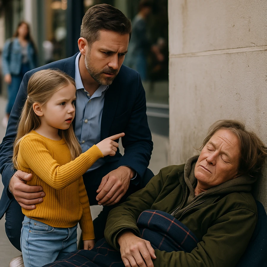 Aquella tarde, padre e hija caminaban por una avenida iluminada por escaparates navideños. Sofía se detuvo de golpe frente a una esquina y señaló a una figura encogida bajo una manta vieja: una mujer de rostro cansado y manos temblorosas dormía en el suelo.
