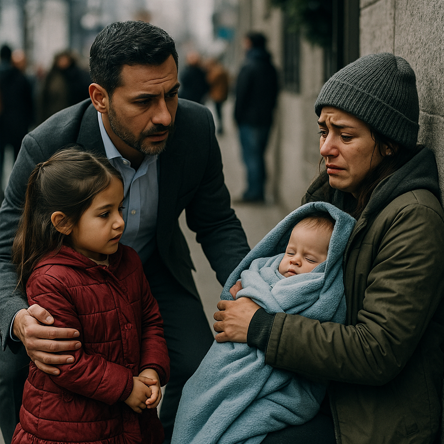 Julián giró la cabeza hacia la acera. Allí, entre la lluvia y el viento, una joven mujer estaba sentada contra la pared, abrazando a un bebé envuelto en una manta húmeda. Su rostro pálido mostraba el cansancio y la desesperación de quien ya no espera ayuda.