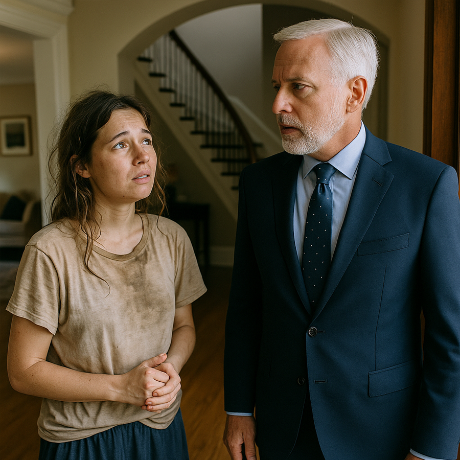 Frente a él estaba una mujer joven, sucia, delgada, con ojeras marcadas y ropa visiblemente desgastada. En las manos sostenía un trapo, y sus dedos temblaban como si no comiera hace días.