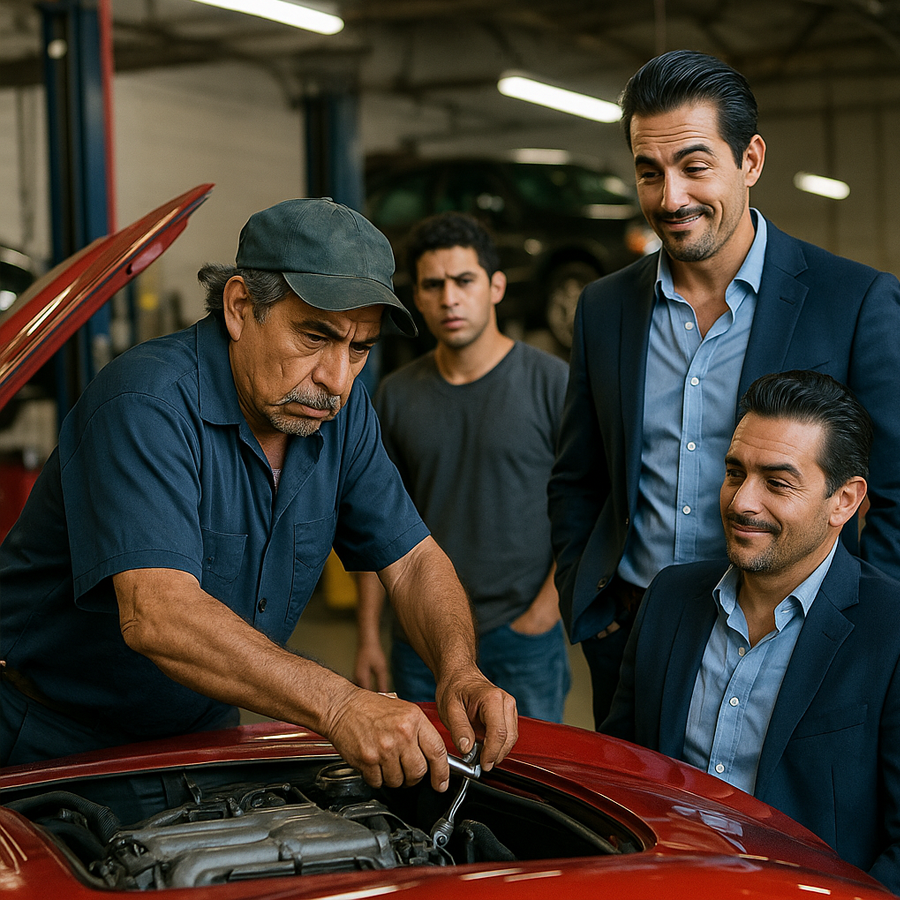 —¡Escuchen, todos! —anunció con una sonrisa burlona—. Mi auto no arranca. Ya lo revisaron tres de mis mecánicos y ninguno pudo con él.