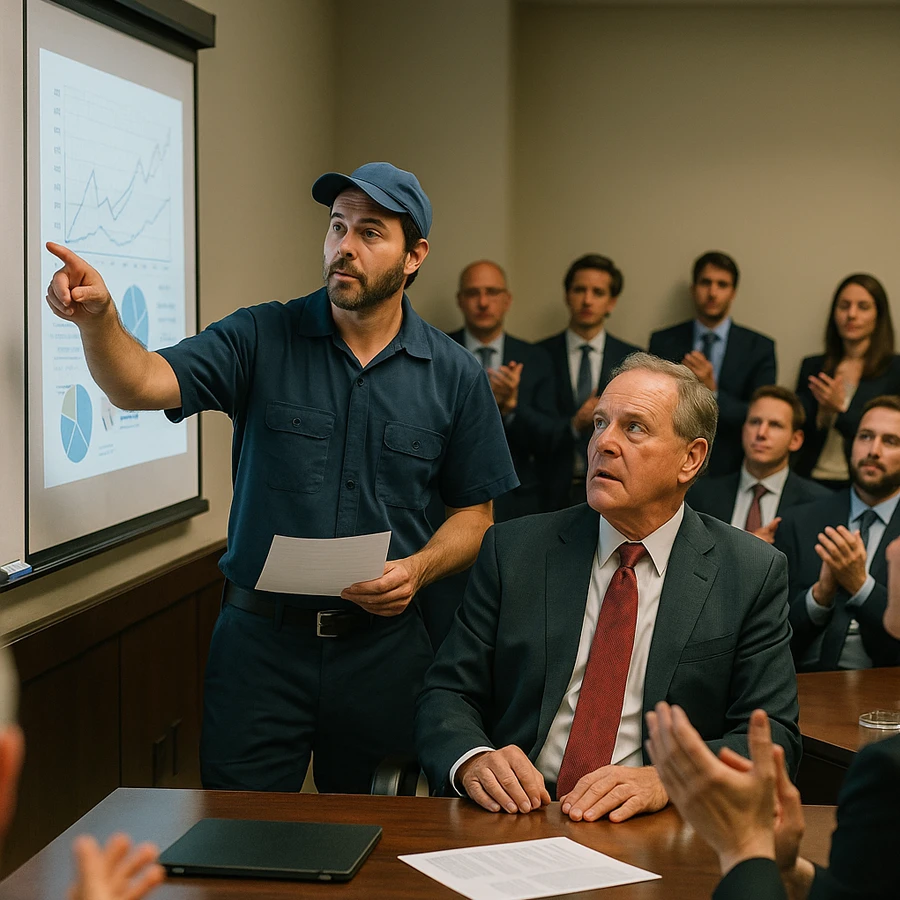 El conserje se acercó al proyector y observó los diagramas. Mientras los demás veían números incomprensibles, él notó algo distinto: un detalle mínimo que había pasado desapercibido. Con pasos seguros, tomó un marcador y comenzó a señalar la falla. En cuestión de minutos, propuso una solución tan sencilla como brillante.