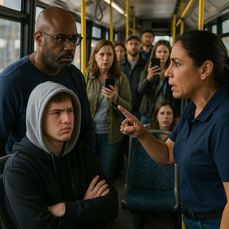 El hombre trajeado, cada vez más acorralado, bajó del autobús en la siguiente parada sin mirar a nadie. Su arrogancia se había desmoronado frente a la valentía de aquel joven.