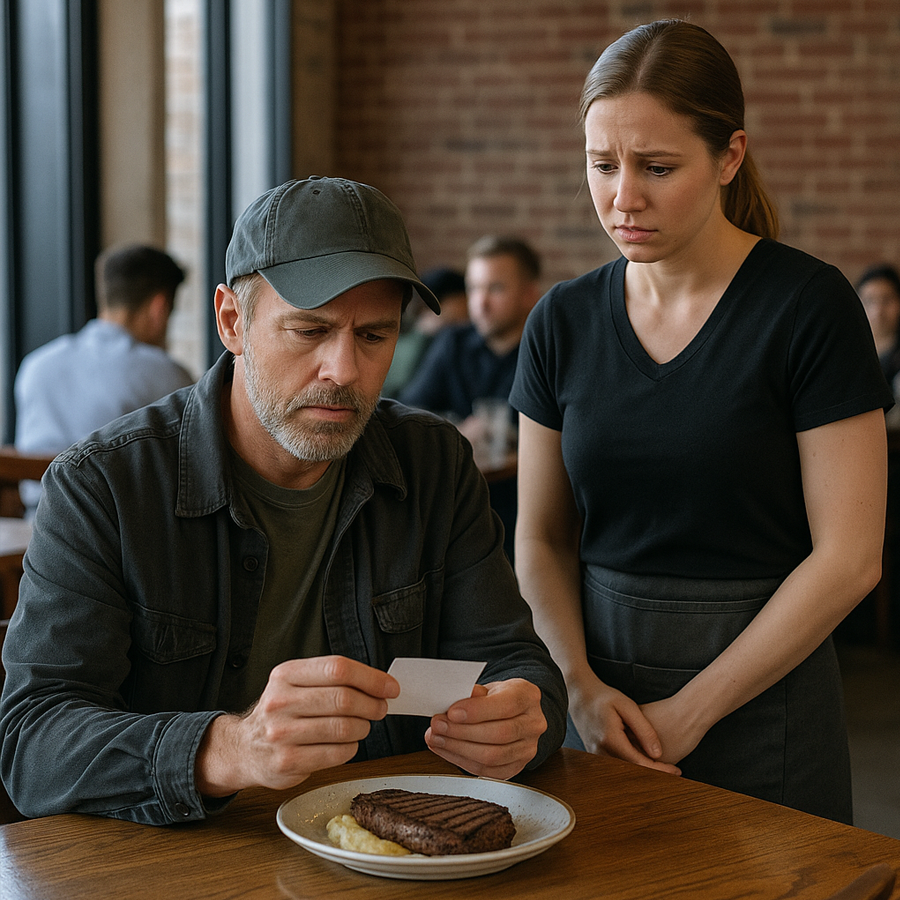 Ella no se fue de inmediato. Parecía dudar. Finalmente, dejó discretamente una pequeña nota doblada junto al plato y se alejó.