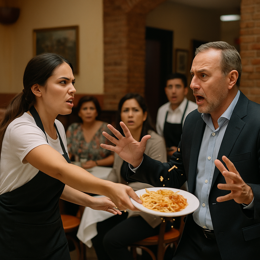 Minutos después, ella volvió con su plato principal: pasta con mariscos, su pedido de siempre. Al servirlo, él fingió tropezar para hacerla derramar parte del contenido.