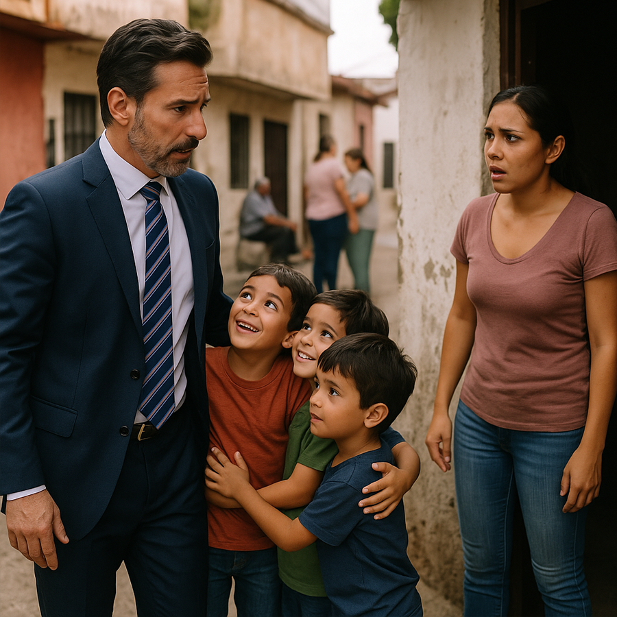 Alejandro, sorprendido, intentó explicarles que debía irse, pero los niños fueron más rápidos: le tomaron de las manos y lo arrastraron hacia su casa entre risas y gritos de alegría. Los transeúntes observaban la escena sin entender si era una broma o un acto heroico de inocencia pura.