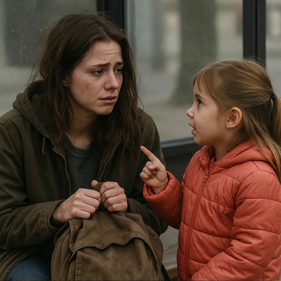 Las personas que aguardaban el autobús escucharon la frase. El silencio se hizo más pesado que nunca. El padre, incómodo, intentó llevarse a la niña, pero ella se aferró a la mano de la joven sin hogar.