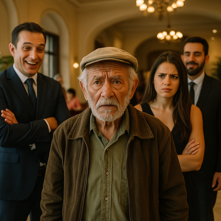 “Un anciano humilde entró a un lujoso hotel diciendo que era el dueño. Todos rieron, los empleados lo despreciaron y algunos huéspedes lo miraron con burla… hasta que minutos después llegó una limusina negra y el destino les dio la lección más grande de sus vidas. Lo que ocurrió dentro del salón principal cambió por completo la historia del lugar.”