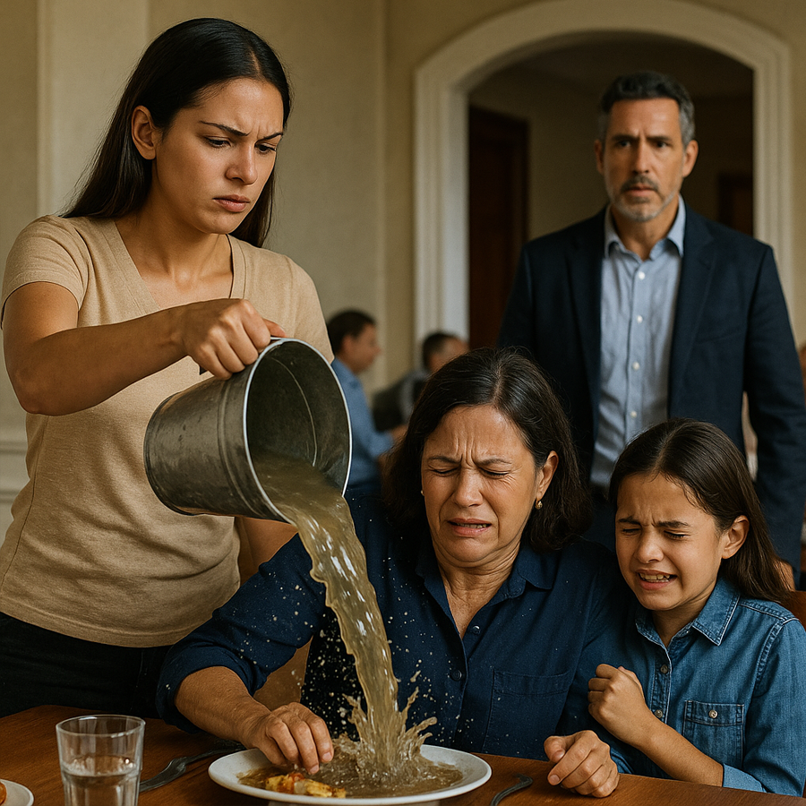 El agua cayó sobre sus ropas, sobre el mantel, sobre los platos. La madre de Esteban retrocedió instintivamente, mientras la niña, con los ojos cerrados y el rostro tenso, buscaba refugio en el brazo de su abuela.
