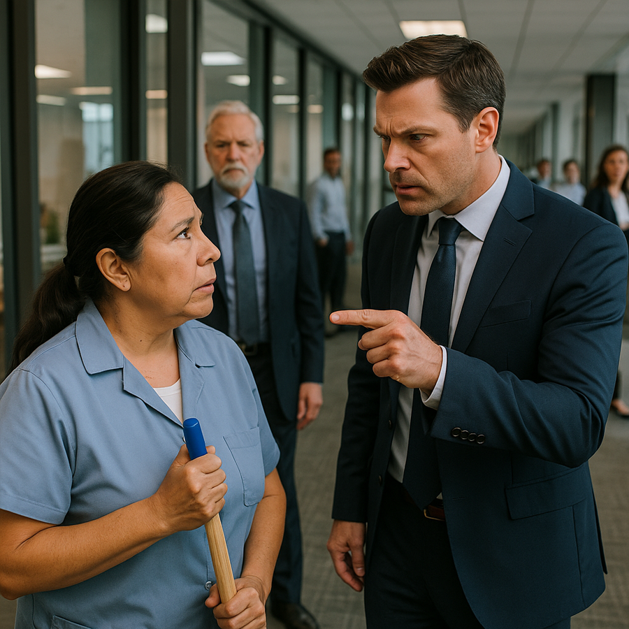 Esa misma mañana, Clara estaba limpiando la sala de juntas. Patrick entró con su asistente y se molestó al verla.