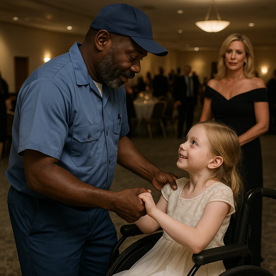 En un evento escolar, donde las luces brillaban y los aplausos resonaban, ocurrió una escena que nadie olvidará. Una niña en silla de ruedas pidió bailar. Todos dudaron, algunos sonrieron con incomodidad y otros apartaron la mirada. Pero un hombre sencillo, vestido con uniforme de conserje, se adelantó sin pensarlo. Lo que no sabía era que, entre la multitud, la madre de la niña —una poderosa mujer millonaria— observaba cada detalle.