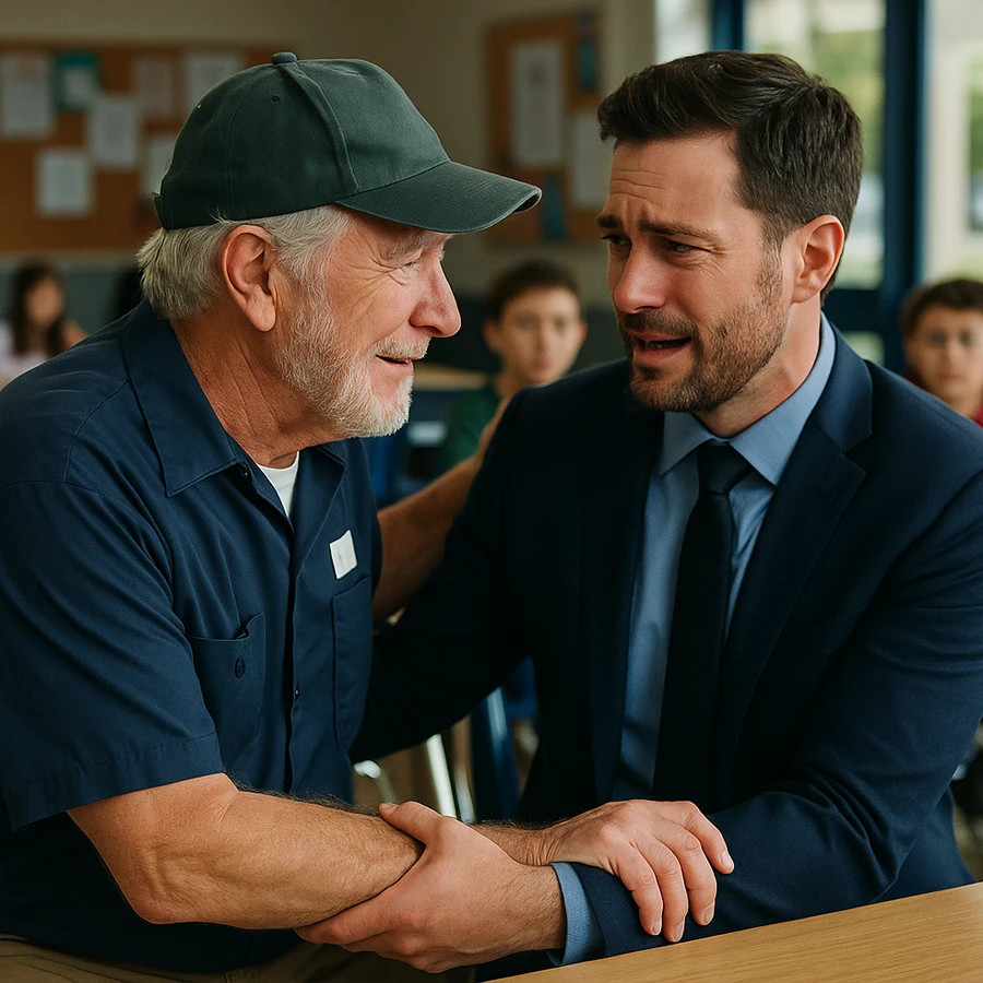 Décadas después, Samuel, ahora convertido en un empresario exitoso, regresó a su antigua escuela para una ceremonia de aniversario. Allí, en un rincón del pasillo, vio a un anciano de cabello blanco y rostro cansado: don Manuel, todavía trabajando como conserje, aunque ya con muchas dificultades físicas.