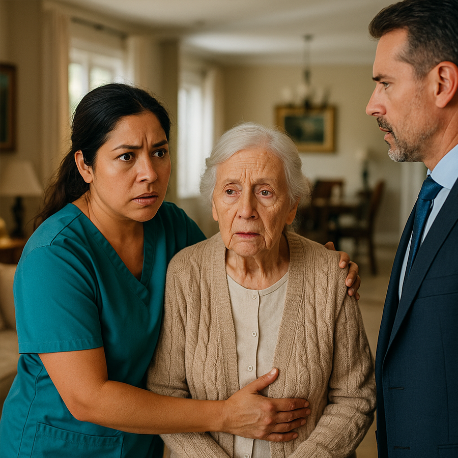 Alejandro corrió hacia el interior y se quedó paralizado: su hermano Miguel, visiblemente alterado, discutía con Clara, la cuidadora de su madre, una mujer sencilla de rostro amable y manos agrietadas por el trabajo. En medio de ambos, su madre, Doña Isabel, observaba confundida, con los ojos perdidos y el cabello despeinado.