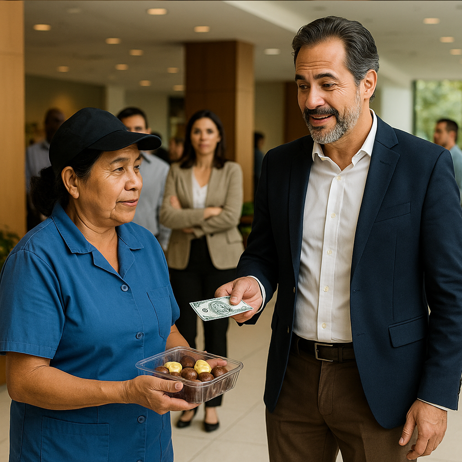 Aquel día, la empresa estaba agitada por una visita inesperada: una joven de apariencia humilde llamada Lina, que ofrecía bombones artesanales para ayudar a financiar un pequeño proyecto comunitario. Su voz era suave, su presencia sencilla, pero la sinceridad de su sonrisa llamaba la atención.