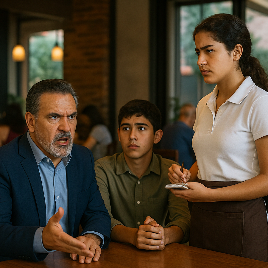 El camarero, incómodo, bajó la mirada, pero antes de que pudiera decir algo, una mesera joven llamada Laura se acercó.