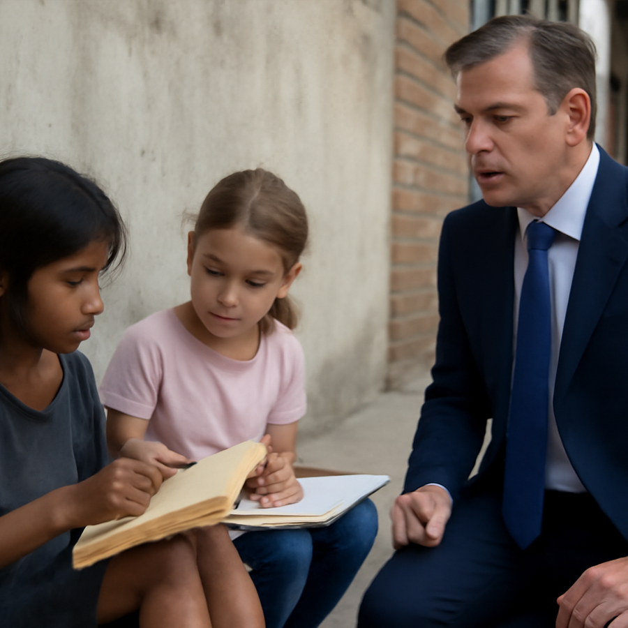 Lo que el millonario no sabía en ese momento era que esa decisión cambiaría la vida de todos los involucrados. Sin pensarlo dos veces, se acercó a las niñas y las miró detenidamente. Su hija, que estaba intrigada por la situación, tocó suavemente el brazo de su padre, como pidiendo permiso para intervenir. El millonario, observando el cuaderno arrugado y las palabras que no se alcanzaban a entender, decidió algo impensado: sacó su billetera y ofreció una suma significativa de dinero a la niña de la calle, mientras hablaba suavemente con su hija.