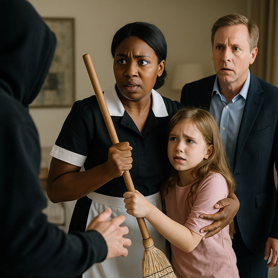 Al acercarse, Ernesto vio una escena que lo dejó helado: la criada, María, se interponía con valentía entre Lucía y un hombre que intentaba irrumpir en la habitación. Con una escoba en la mano, María protegía a la niña con una ferocidad que contrastaba con su uniforme humilde.