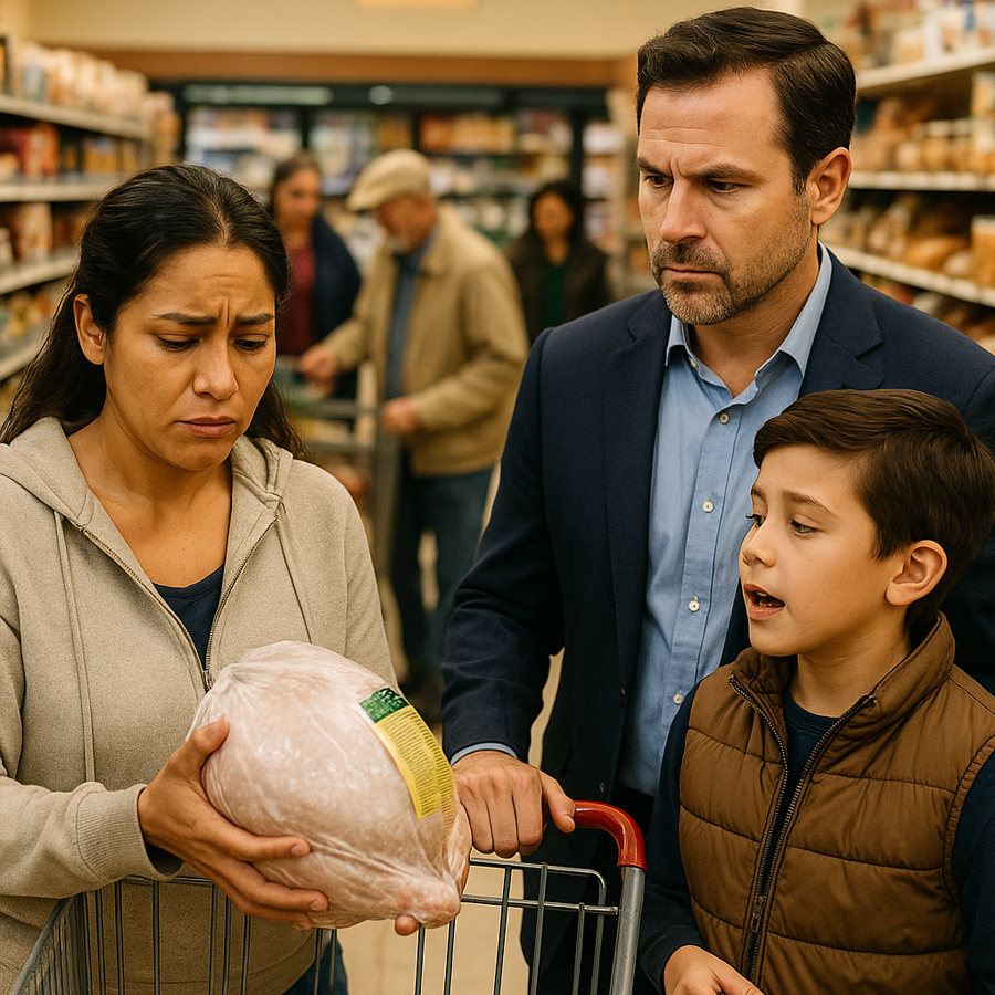 Mientras Luis revisaba los precios sin realmente preocuparse por ellos, su hijo observaba a una mujer a pocos metros. Ella sostenía un pavo entre sus manos, lo miraba un rato, y luego lo devolvía con gesto triste al refrigerador. Llevaba una sudadera vieja y un carrito con apenas algunos productos básicos: arroz, leche, pan.