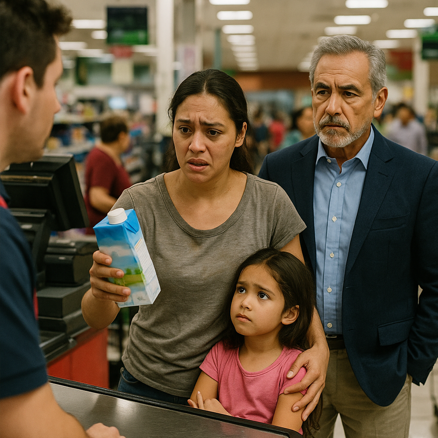 “Un millonario estaba en la fila del supermercado cuando vio a una madre humilde devolviendo una caja de leche al cajero porque no tenía dinero suficiente para pagarla. Su hija lloraba de hambre, y el silencio en la tienda era abrumador. Pero lo que el hombre hizo después dejó a todos sin palabras: una acción inesperada que cambió la vida de aquella mujer para siempre y reveló el verdadero significado de la generosidad.”