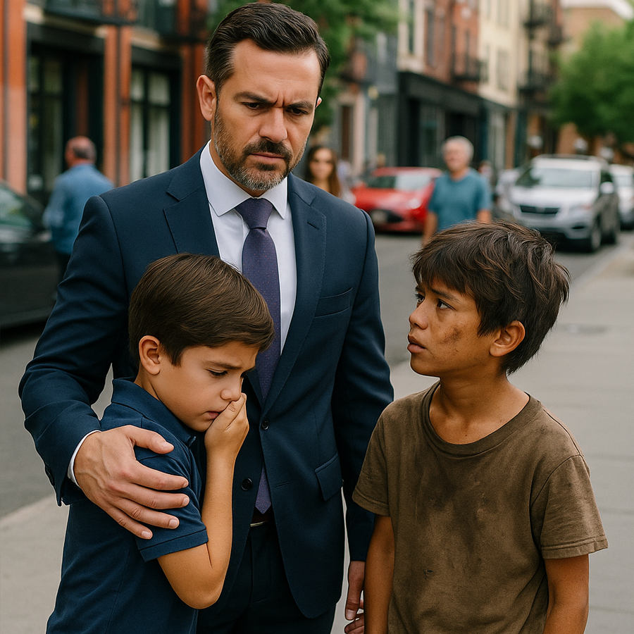 “Un millonario humilló a un niño de la calle frente a su propio hijo — pero lo que el pequeño le susurró al oído cambió su vida para siempre: ‘Papá, él es mi hermano’. Nadie imaginaba el giro desgarrador que revelaría la verdad oculta detrás de una historia de abandono, redención y segundas oportunidades. Lo que sucedió después conmovió a toda la ciudad y demostró que la sangre y el corazón siempre encuentran el camino de vuelta.”