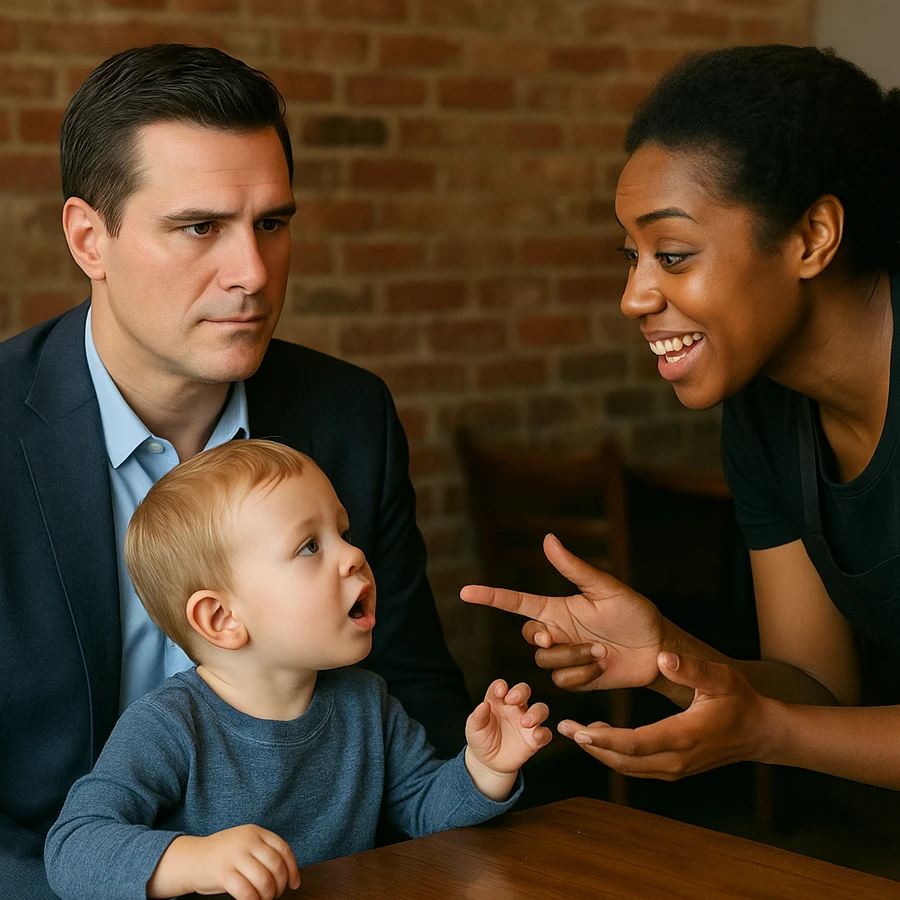 La camarera, lejos de rendirse, siguió el juego. Le mostró objetos de la mesa, pronunciando sus nombres despacio, animándolo a repetir. “Cuchara”, “plato”, “agua”. El niño, entre risas y torpeza, comenzó a imitarla. Cada sílaba era un triunfo.