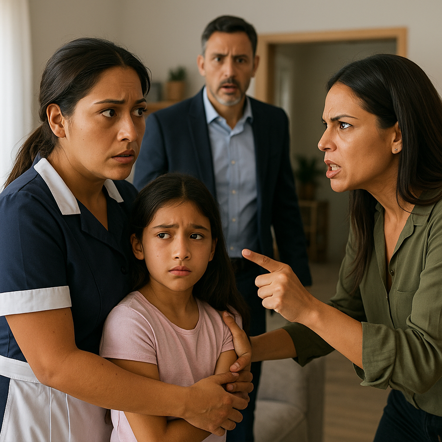 “Un millonario regresó a casa antes de lo previsto… y lo que vio lo dejó paralizado. Su empleada doméstica abrazaba a su hija, intentando protegerla de la furia de su esposa. Lo que hizo el empresario segundos después cambió la vida de todos para siempre. Nadie imaginó que esa noche una familia entera aprendería el verdadero valor del amor y la lealtad.”
