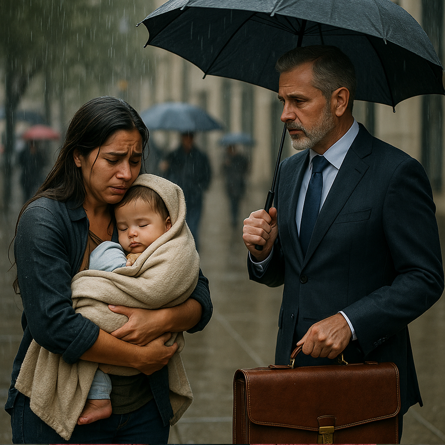Al otro lado de la calle, bajo la intensa lluvia, una joven madre cargaba a su bebé envuelto en una manta. Caminaba descalza, con una maleta vieja en la mano, intentando cubrirse con una bolsa de plástico. Esteban la observó unos segundos, pero algo en su mirada lo conmovió. Había desesperación, miedo… y ternura.