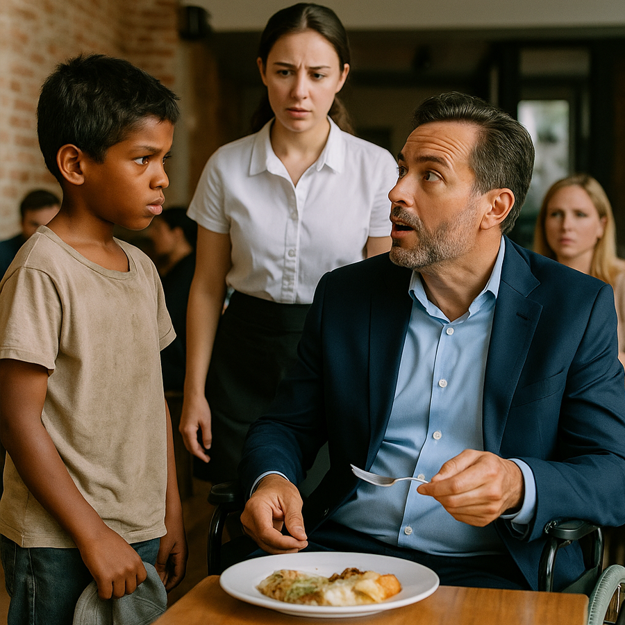 “Un multimillonario en silla de ruedas se burló de un niño pobre que le pidió las sobras de su plato, sin imaginar que ese encuentro cambiaría su vida. ‘Si me das tu comida, te enseño a caminar’, dijo el pequeño. Dos minutos después, lo que ocurrió dejó a todos en el restaurante en completo silencio y reveló una lección que ni el dinero ni los años de poder podrían haberle enseñado.”
