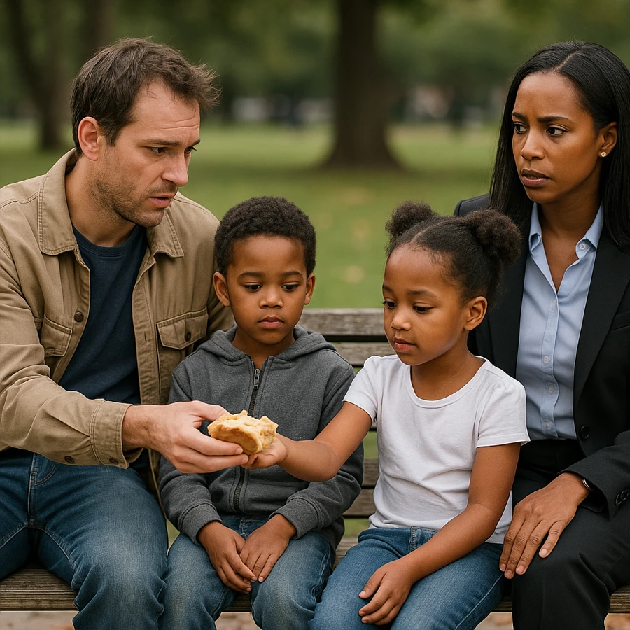 Mientras su hijo jugaba, una niña se le acercó tímidamente. Tenía el cabello recogido en dos coletas y unos ojos brillantes que parecían pedir algo más que atención. Sin pensarlo mucho, el padre abrió su envoltorio y partió en dos el sándwich, ofreciéndole la mitad. La niña aceptó con una sonrisa que iluminó todo a su alrededor. Fue entonces cuando ocurrió lo inesperado.