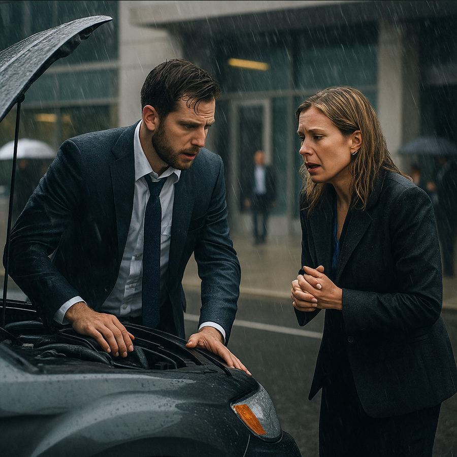 A mitad de camino, mientras conducía hacia el centro de la ciudad, vio algo al costado de la carretera: un coche parado, el capó abierto, y una mujer empapada intentando arrancarlo. Los autos pasaban sin detenerse. Lucas dudó unos segundos.