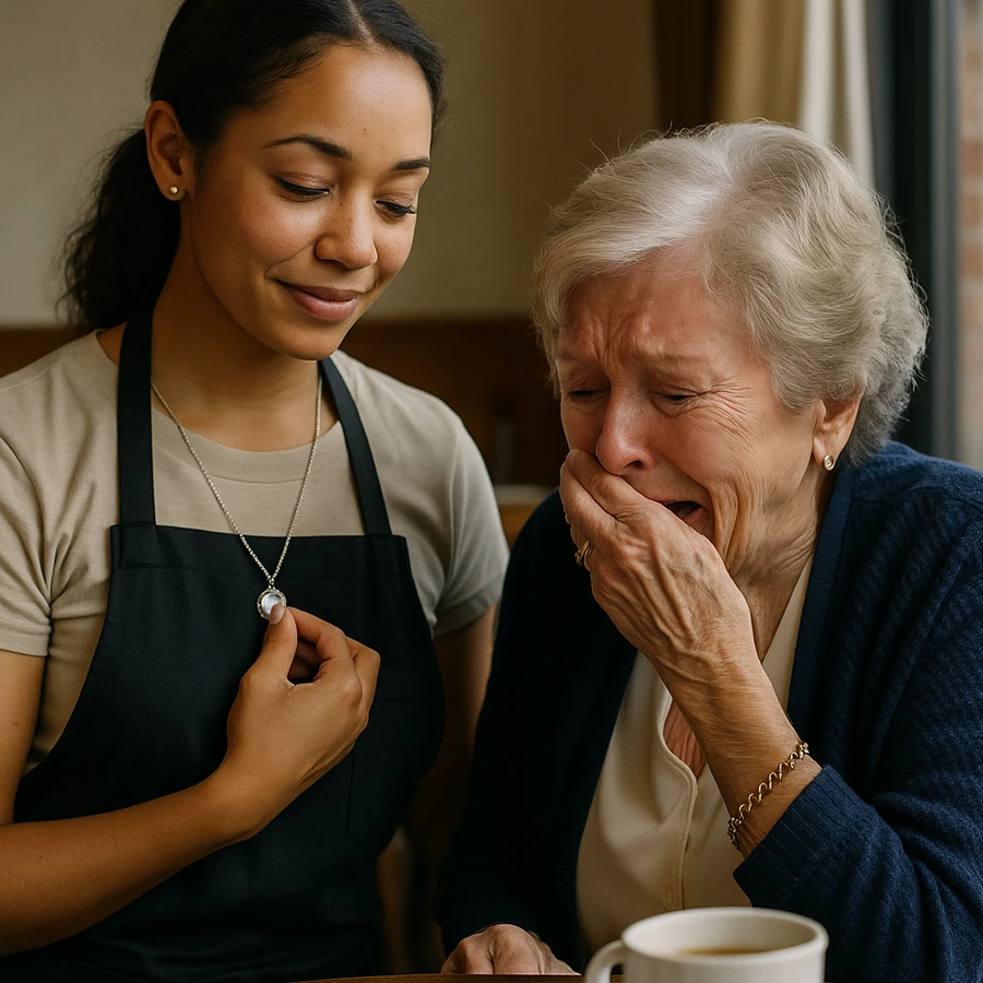 Fue atendida por Anna, una joven camarera amable y trabajadora. Vestía un uniforme sencillo, pero lo que más llamó la atención de Margaret no fue su sonrisa, sino un pequeño collar plateado que colgaba de su cuello.