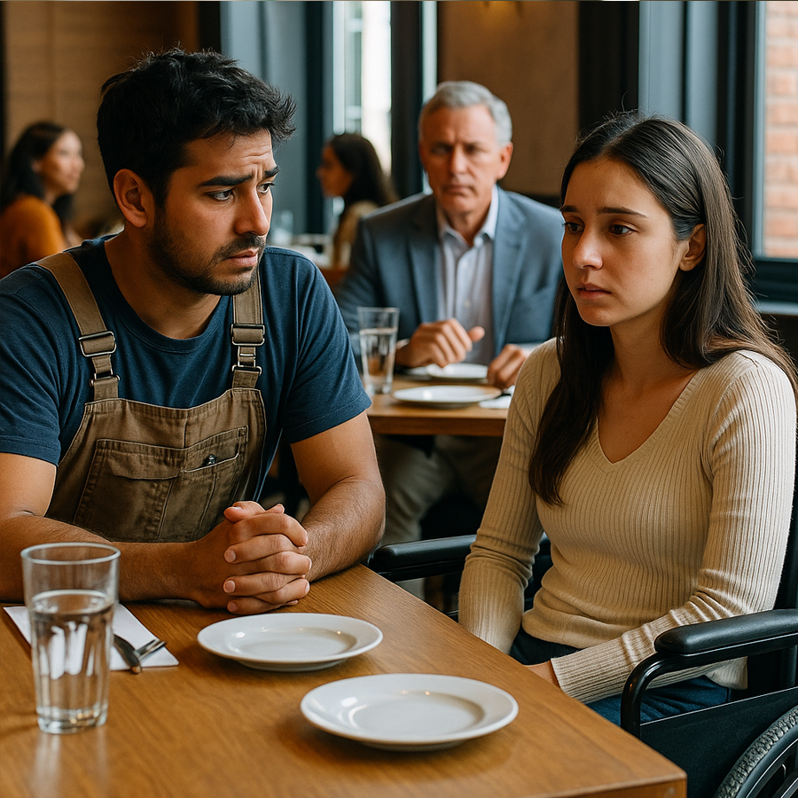 Mientras esperaba, una mujer joven entró al restaurante. De cabello oscuro, rostro delicado y movimientos pausados, avanzaba en silla de ruedas. Los clientes la observaban con una mezcla de curiosidad y compasión. Ella levantó la cabeza con dignidad y se dirigió a una mesa cercana, justo donde Julián esperaba.