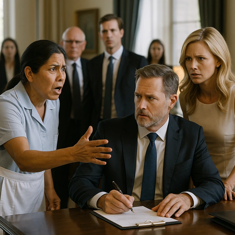 La sala entera quedó paralizada. Catherine intentó reaccionar: “¡Es mentira! ¡Solo son delirios de una sirvienta!”. Pero ya era tarde. Richard, con manos temblorosas, comenzó a revisar con más atención las cláusulas del contrato. Los abogados, nerviosos, confirmaron lo imposible: cada palabra coincidía con lo que Elena denunciaba.