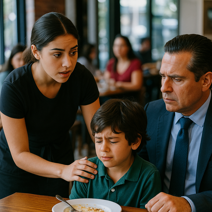 El niño, Matías, se mostraba inquieto. Apenas tocaba su comida, jugaba con el tenedor y miraba hacia el suelo. Sofía, al pasar junto a su mesa, notó algo que los demás no.