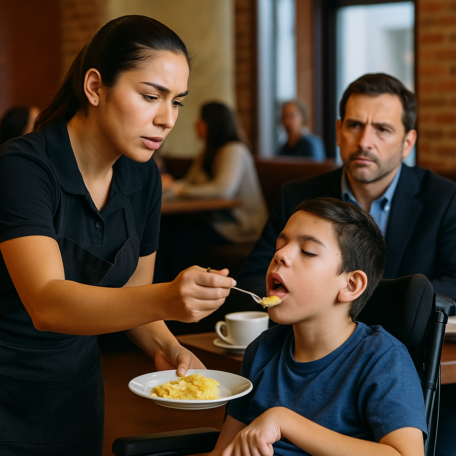 “Una joven mesera vio a un niño con discapacidad luchando por comer solo y, sin pensarlo, se acercó para ayudarlo. No sabía que el hombre que la observaba desde una esquina era el padre millonario del pequeño. Lo que ocurrió después dejó a todos sin palabras: un acto de bondad que cambió tres vidas, demostró que el verdadero valor no se mide en dinero y reveló un secreto que nadie imaginaba.”